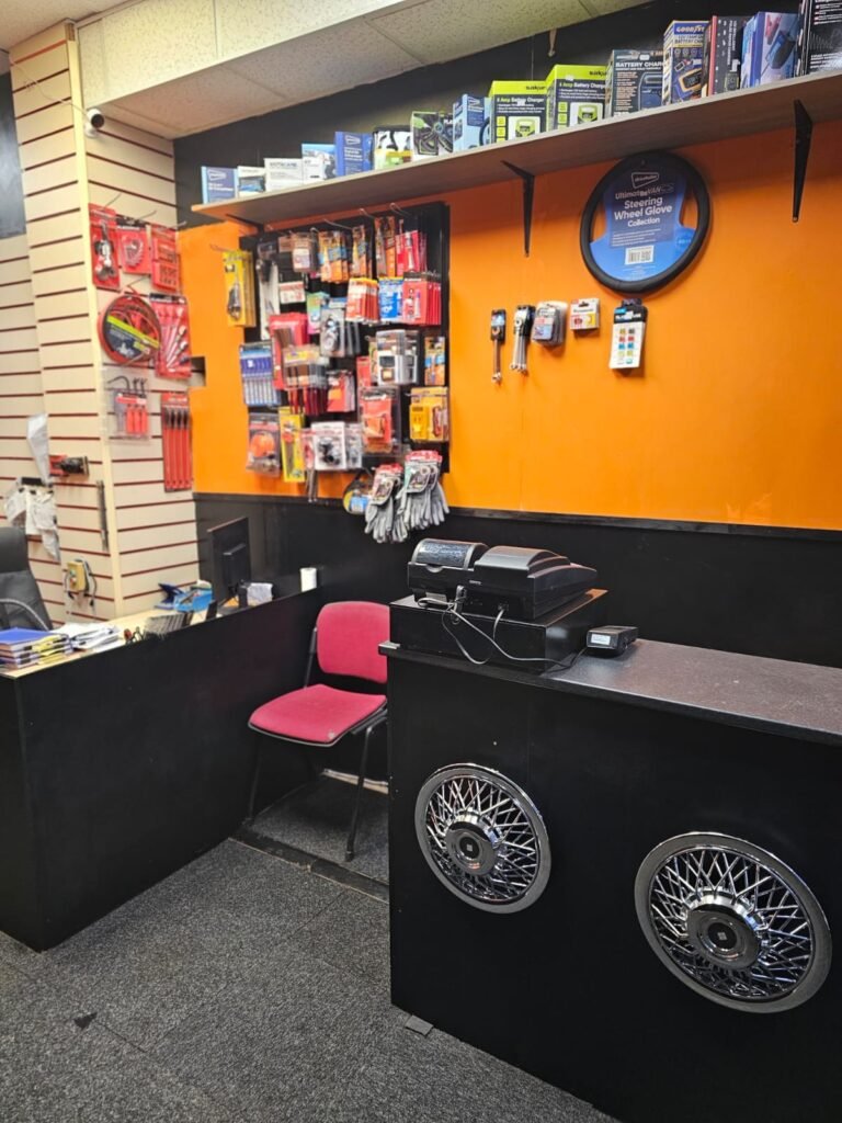 Zenith Motors has a straightforward and practical setup that makes it easy for customers to find exactly what they need. The shop uses a bold orange and black theme, with cool car hubcaps on the front counter that give it a unique, personal touch. The walls are lined with neatly organized shelves and racks full of parts, so the space feels tidy and efficient. There is a simple seating area for customers to wait, making the whole shop feel like a friendly, reliable spot for any car owner.